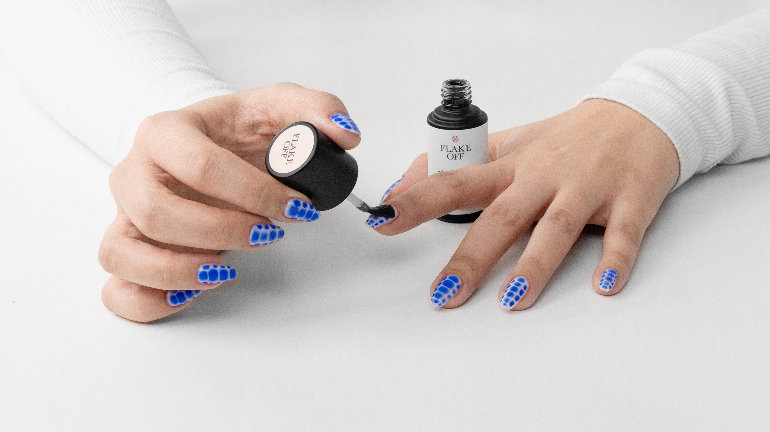 Gently buff shine off polished nails to allow flake off remover to work most effectively.