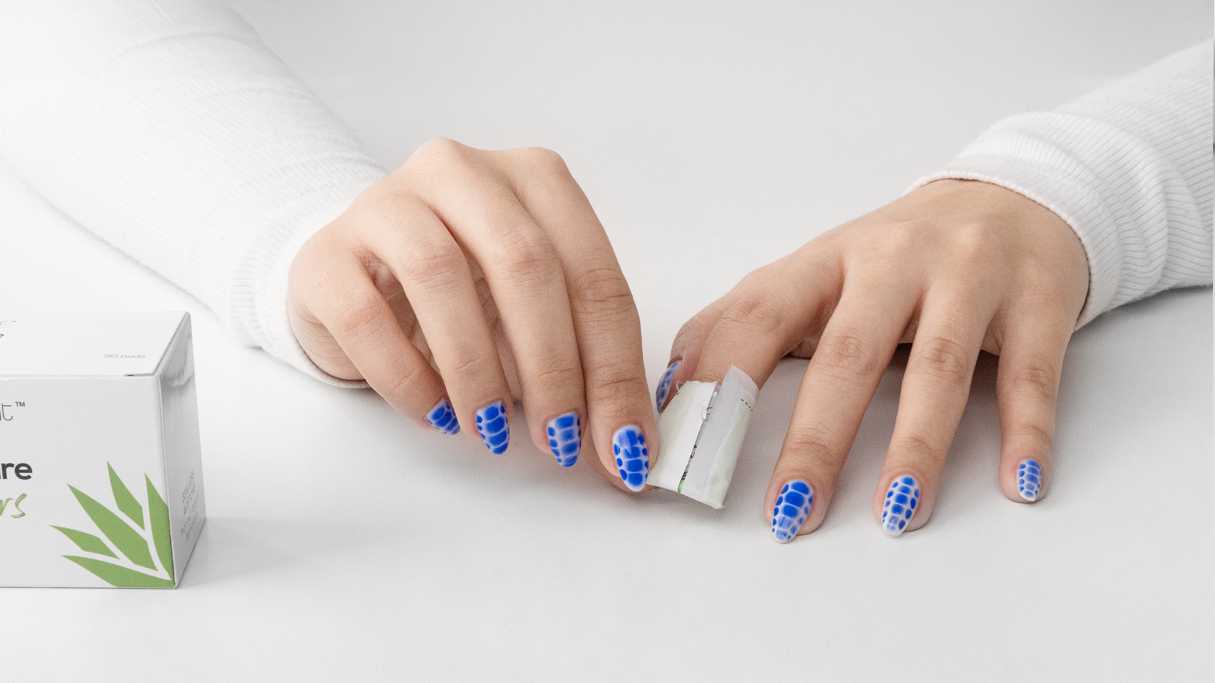 Tear across the dotted line and place the nail inside the pouch, pressing the nail surface against the moist pad.