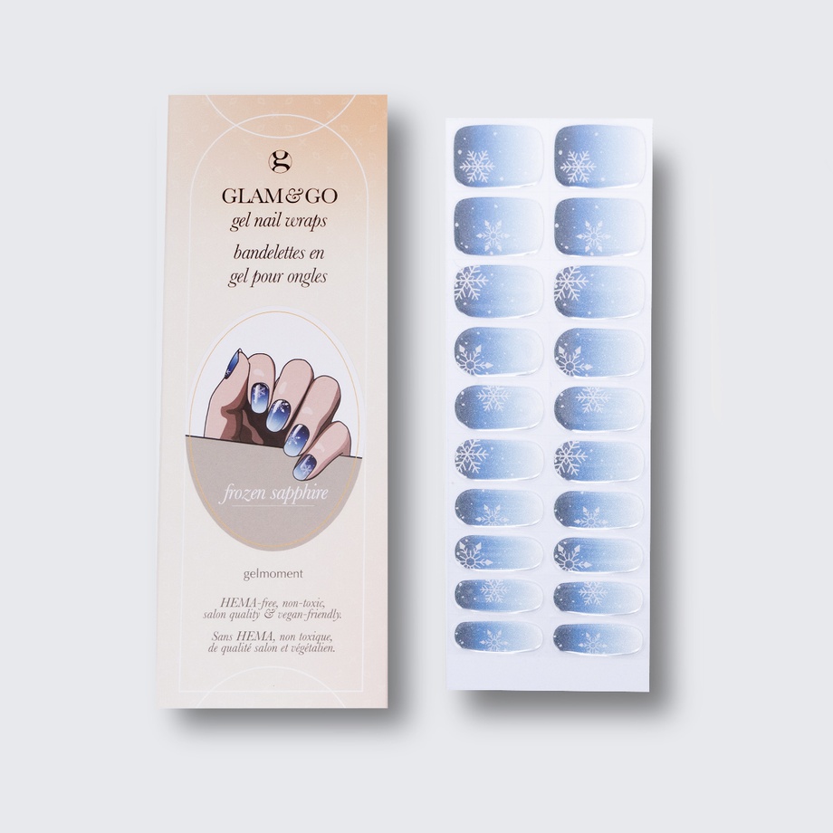 Our GLAM & GO gel nail wraps ensure that no matter how complex your chosen nail design, the application process remains incredibly simple. Our GLAM & GO gel nail wraps require no glue, base coat, or top coat—just peel them off the packaging, apply them to your nail, trim to size, cure twice, and voilà!
